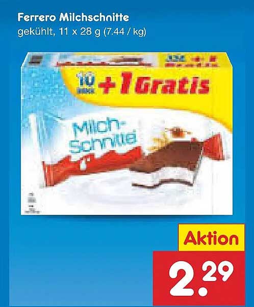 Sehen Sie sich jetzt das Ferrero Milchschnitte, 11 x 28 g (7,44 €/kg) Angebot im Netto Marken-Discount Prospekt an. Dieses Angebot ist gültig von 23.11.2025 bis 29.11.2025.
