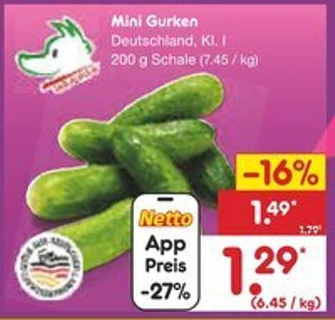 Aktuell erhalten Sie die Mini Gurken zum sensationellen Preis von nur 1,29 €! Das ist eine Ersparnis von 16 % gegenüber dem ursprünglichen Preis von 1,49 €. Damit sparen Sie nicht nur Geld, sondern erhalten auch eine gesunde Snack-Option, die sich gut in jedem Haushalt macht.