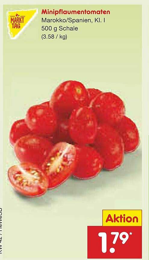 Im aktuellen Netto-Angebot erhalten Sie die Minipfläumchentomaten für nur 1,79 €. Der reguläre Preis liegt bei etwa 3,58 € pro Kilogramm. Das bedeutet, dass Sie bei diesem Kauf eine erhebliche Ersparnis von fast 50% erzielen können. Ein perfektes Angebot für alle, die frisches Gemüse lieben!