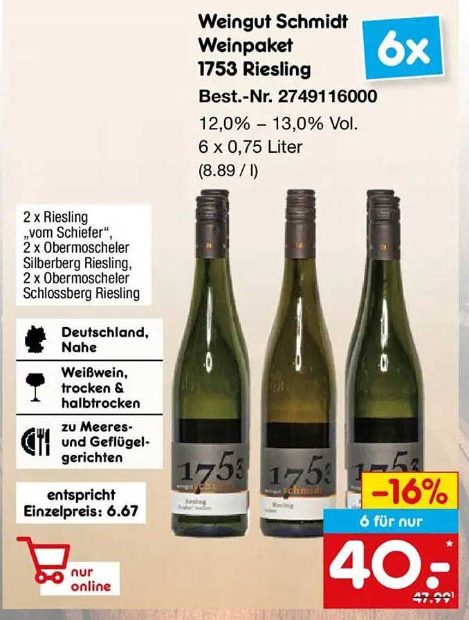 Sehen Sie sich jetzt das Weingut Schmidt Weinpaket 1753 Riesling - 6 x 0,75 Liter Angebot im Netto Marken-Discount Prospekt an. Dieses Angebot ist gültig von 01.04.2025 bis 30.04.2025.