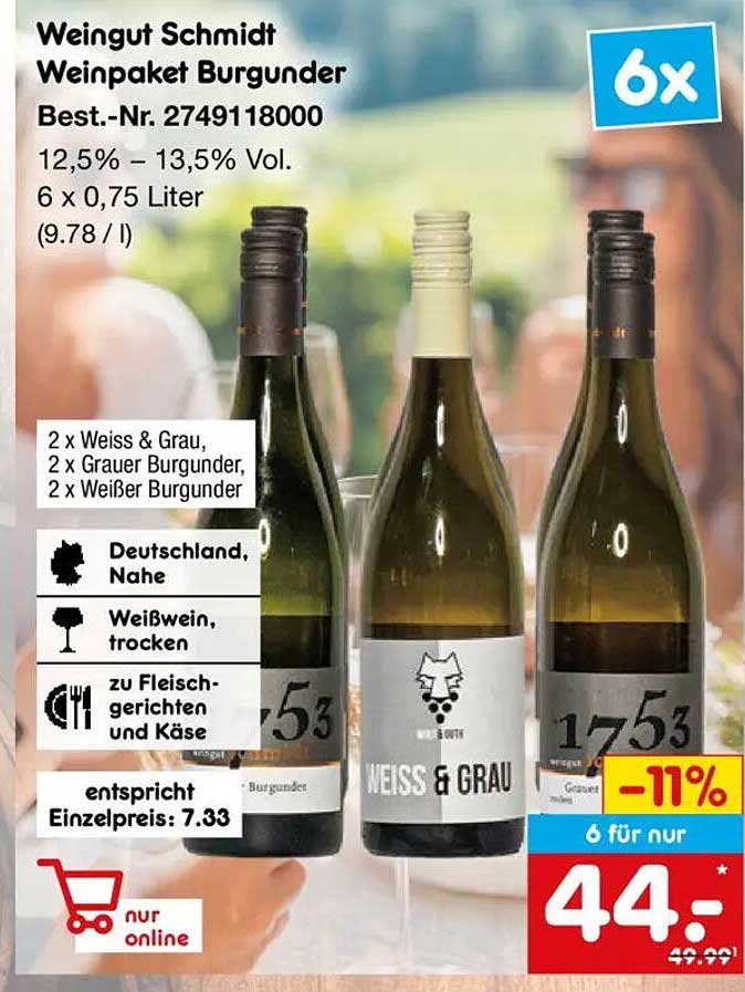 Sehen Sie sich jetzt das Weingut Schmidt Weinpaket Burgunder Angebot im Netto Marken-Discount Prospekt an. Dieses Angebot ist gültig von 01.04.2025 bis 30.04.2025.