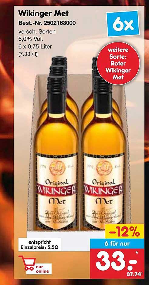 Entdecken Sie das großartige Wikinger Met Angebot im neuesten Netto Marken-Discount Prospekt. Neben diesem Angebot finden Sie noch viele weitere attraktive Rabatte. Sie können das Wikinger Met einfach online über die Netto Marken-Discount Website bestellen oder in einem Geschäft in Ihrer Nähe kaufen.