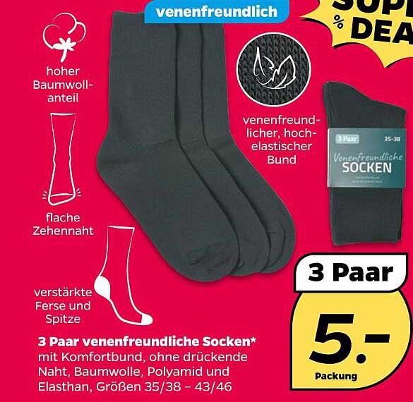 Sehen Sie sich jetzt das 3 Paar venenfreundliche Socken Angebot im NETTO Prospekt an. Dieses Angebot ist gültig von 22.09.2025 bis 27.09.2025.