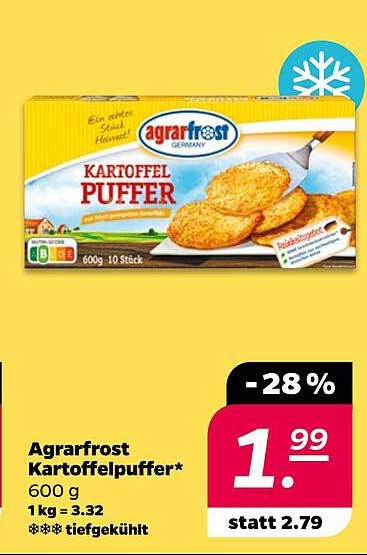 Sehen Sie sich jetzt das Agrarfrost Kartoffelpuffer* Angebot im NETTO Prospekt an. Dieses Angebot ist gültig von 30.09.2024 bis 05.10.2024.