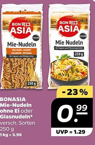 Sehen Sie sich das Bon Asia Mie-Nudeln Ohne Ei Oder Glasnudeln* Angebot bei NETTO an! Dieses fantastische Angebot ist jetzt im neuesten NETTO Prospekt verfügbar. Nutzen Sie diese Chance und sparen Sie viel bei Ihrem Einkauf.