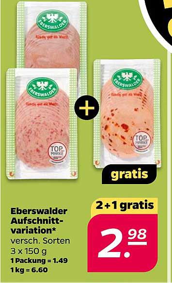 Sehen Sie sich jetzt das Eberswalder Aufschnittvariation – 2 + 1 gratis Angebot im NETTO Prospekt an. Dieses Angebot ist gültig von 28.07.2025 bis 02.08.2025.