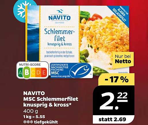 Sehen Sie sich jetzt das NAVITO MSC Schlemmerfilet knusprig & kross 400 g Angebot im NETTO Prospekt an. Dieses Angebot ist gültig von 31.03.2025 bis 05.04.2025.