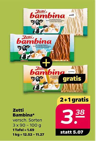 Der reguläre Preis für die Zetti Bambina Schokoladentafeln beträgt normalerweise 5,07 €. Durch dieses unschlagbare Angebot zahlen Sie nur 3,38 € und erhalten zusätzlich eine Tafel gratis! Das macht eine Ersparnis von fast 30%! Wo sonst finden Sie so viel Genuss zu einem solch hervorragenden Preis?
