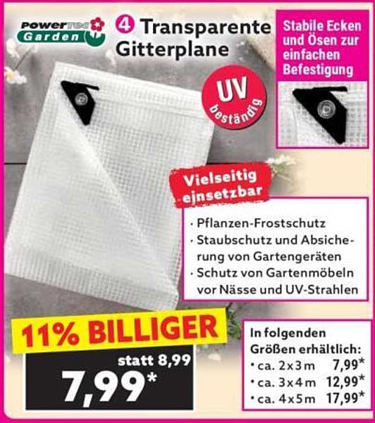 Diese praktischen Gitterplanen sind zum Aktionspreis von nur 7,99 Euro erhältlich, anstatt der regulären 8,99 Euro. Dies entspricht einer Ersparnis von 11% und macht das Angebot besonders attraktiv für Gartenbesitzer.