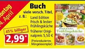 Sehen Sie sich jetzt das Buch viele versch. Titel, z. B.: Land Edition Frisch & lecker Frühlingsküche Angebot im Norma Prospekt an. Dieses Angebot ist gültig von 14.04.2025 bis 20.04.2025.