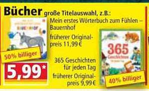 Die Preise sind unschlagbar! Das Wörterbuch wird für nur 5,99 € angeboten, das entspricht einer Ersparnis von 50% gegenüber dem ursprünglichen Preis von 11,99 €. Das Buch "365 Geschichten für jeden Tag" ist nun für 5,99 € erhältlich, was eine Ersparnis von 40% gegenüber dem ursprünglichen Preis von 9,99 € bedeutet. Nutzen Sie diese Gelegenheit, um hochwertige Literatur zu einem Bruchteil des Preises zu erwerben!