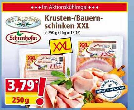 Entdecken Sie unser aktuelles Angebot: Der Krusten-/Bauernschinken XXL von St. Alpine und Schinkenhofer. Dieses köstliche Produkt aus der Aktionskühlregal bringt nicht nur einen unverwechselbaren Geschmack auf Ihren Tisch, sondern ist auch in einer attraktiven XXL-Packung erhältlich, die ideal für die gesamte Familie ist.