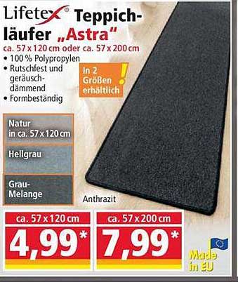 Sehen Sie sich das Lifetex Teppichläufer „Astra“ Angebot bei Norma an! Dieses fantastische Angebot ist jetzt im neuesten Norma Prospekt verfügbar. Nutzen Sie diese Chance und sparen Sie viel bei Ihrem Einkauf.