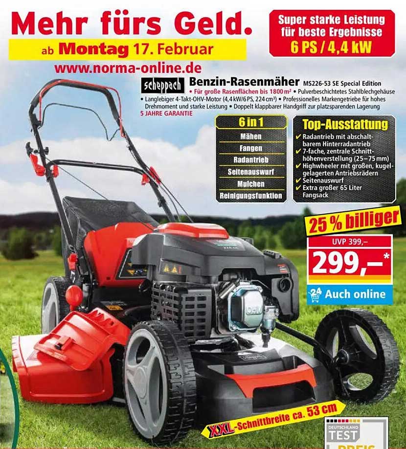 Entdecken Sie das großartige Scheppach Benzin-Rasenmäher Angebot im neuesten Norma Prospekt. Neben diesem Angebot finden Sie noch viele weitere attraktive Rabatte. Sie können das Scheppach Benzin-Rasenmäher einfach online über die Norma Website bestellen oder in einem Geschäft in Ihrer Nähe kaufen.