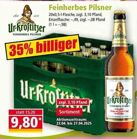 Sehen Sie sich jetzt das Ur-Krostitzer Feinherves Pilsner - 35% billiger Angebot im Norma Prospekt an. Dieses Angebot ist gültig von 22.04.2025 bis 27.04.2025.