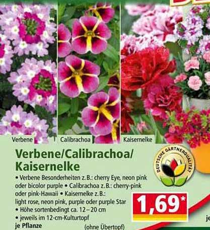 Sehen Sie sich jetzt das Verbene/Calibrachoa/Kaisernelke Angebot im Norma Prospekt an. Dieses Angebot ist gültig von 10.06.2025 bis 15.06.2025.