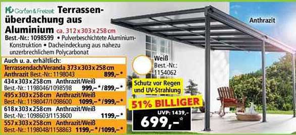 Wer an warmen Tagen viel Zeit im Freien verbringen möchte, sollte im Norma24 Prospekt nach den neuesten Angeboten für den Garten Ausschau halten. Hier stechen besonders Terrassenüberdachungen aus Aluminium ins Auge, mit denen Sie wind- und wettergeschützt entspannen können. Gartenstühle, Feuerschalen und Auflagen sorgen für Behaglichkeit und Komfort. Für einen gut gepflegten Rasen stehen Aufsitzrasenmäher und Mini-Bagger bereit, damit jede Aufgabe im Handumdrehen erledigt wird.