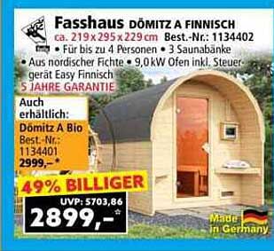 Das Fasshaus Dömitz a Finnisch misst ca. 219 x 295 x 229 cm und bietet Platz für bis zu vier Personen. Es besteht aus hochwertiger nordischer Fichte, die für ihre Langlebigkeit und Widerstandsfähigkeit bekannt ist. Ausgestattet mit drei Saunabänken und einem leistungsstarken 9,0 kW Ofen samt digitaler Steuerung, erleben Sie maximalen Komfort. Die 5 Jahre Garantie sprechen für die Qualität und die Zuverlässigkeit des Produktes.