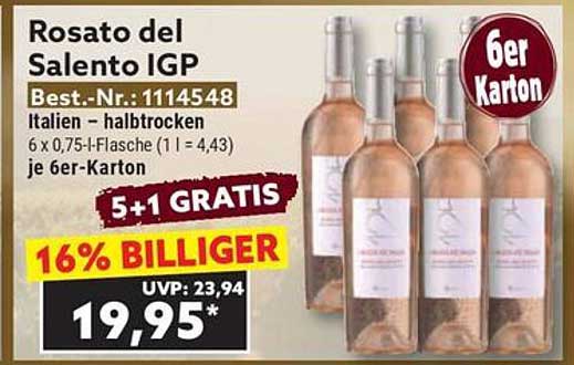 Entdecken Sie den köstlichen Rosato del Salento IGP, ein halbtrockener Wein aus Italien, der in einem praktischen 6er Karton angeboten wird. Perfekt für gesellige Abendessen oder entspannte Nachmittage, ist dieser Wein nicht nur ein Gaumenschmaus, sondern auch ein echtes Schnäppchen. Von 2025-11-01 bis 2025-11-30 ist dieses Angebot besonders verlockend.