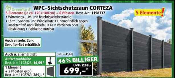 Der aktuelle Preis für den WPC-Sichtschutzzaun CORTEZA beträgt nur 699,- Euro, was einer Ersparnis von 46 % gegenüber dem ursprünglichen Preis von 1299,- Euro entspricht. Dies macht dieses Angebot zu einer hervorragenden Gelegenheit, um Ihr Grundstück sicher und stilvoll einzufrieden. Nutzen Sie diese Chance, um in den Genuss eines hochwertigen Sichtschutzes zu kommen!