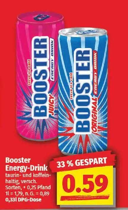 Der Booster Energy-Drink kommt in zwei verlockenden Varianten: der klassischen Original-Variante und der fruchtigen Juicy-Variante. Beide sind in der handlichen 0,33-l-Dose erhältlich und perfekt für unterwegs. Sie sind nicht nur koffeinhaltig, sondern bieten auch einen erfrischenden Geschmack, der Sie belebt und erfrischt.