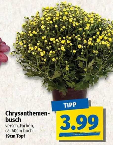 Entdecken Sie den bezaubernden Chrysanthemenbusch, der nicht nur mit seiner Vielfalt an Farben besticht, sondern auch in einem handlichen 19cm Topf zu Ihnen nach Hause kommt. Mit einer beeindruckenden Höhe von ca. 40cm bringt er eine fröhliche Stimmung in jeden Garten, Balkon oder auf Ihre Fensterbank. Dieser Tipp im NP Discount-Prospekt bringt Ihnen die Möglichkeit, Ihr Zuhause sofort zu verschönern.