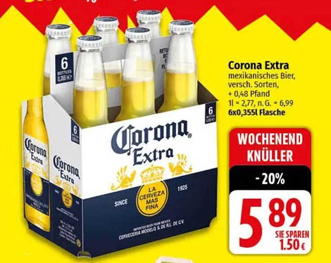 Genießen Sie das erfrischende Erlebnis von Corona Extra, einem der beliebtesten mexikanischen Biere weltweit. Ob für eine Grillparty, einen entspannten Abend mit Freunden oder einfach zum Entspannen nach einem langen Arbeitstag – dieses Bier verspricht Genuss in jedem Schluck. Jetzt in der attraktiven 6er-Packung verfügbar, ist es nicht nur eine leckere Wahl, sondern auch ein echtes Schnäppchen.