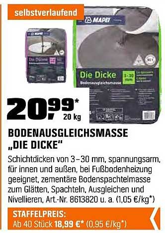 Die Mapei Bodenausgleichsmasse zeichnet sich durch eine Schichtdicke von 3-30 mm aus und eignet sich zur Anwendung mit verschiedenen Materialien wie Fliesen, Teppich oder Laminat. Sie ist auch mit der Artikelnummer 8613820 im Handel erhältlich und ist ein unverzichtbares Werkzeug für jeden Handwerker oder Heimwerker. Mit 20 kg kommen Sie in der Regel sehr weit und können so mehrere Quadratmeter behandeln.