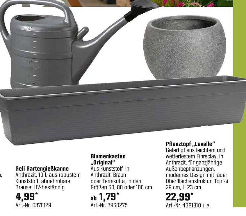 Sehen Sie sich jetzt das Geli Gießkanne Anthrazit 10 l aus robustem Kunststoff Angebot im OBI Prospekt an. Dieses Angebot ist gültig von 06.04.2025 bis 24.04.2025.
