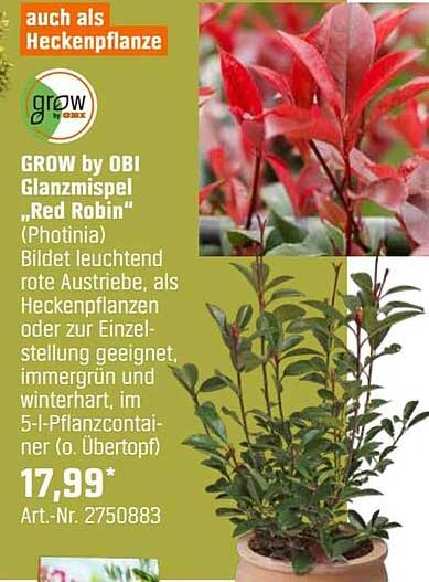 Sehen Sie sich jetzt das GROW by OBI Glanzmispel „Red Robin“ (Photinia) Angebot im OBI Prospekt an. Dieses Angebot ist gültig von 05.05.2025 bis 26.05.2025.