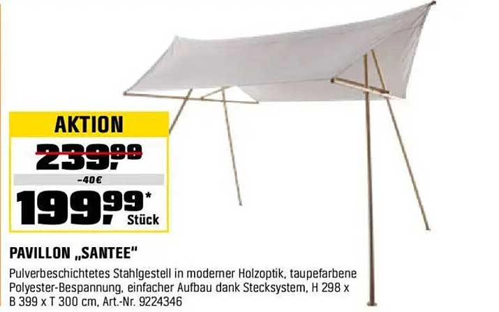 Ursprünglich zum Preis von 239,99 € angeboten, können Sie den PAVILLON „SANTEE“ jetzt für nur 199,99 € erwerben. Das bedeutet eine Ersparnis von 40 €, und somit ein hervorragendes Preis-Leistungs-Verhältnis. Nutzen Sie diese Gelegenheit, um ein hochwertiges und stilvolles Produkt zu einem reduzierten Preis zu erhalten.