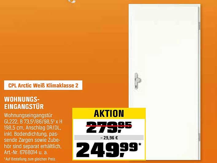 Der reguläre Preis dieser hochwertigen Tür liegt bei 279,95 €. Mit unserem aktuellen Angebot sparen Sie 29,96 €! Das macht den Aktionspreis von nur 249,99 € zur perfekten Gelegenheit für alle, die Wert auf Qualität zum besten Preis legen.