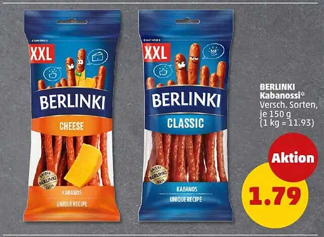 Sehen Sie sich jetzt das BERLINKI Kabanossi, verschiedene Sorten, je 150 g Angebot im Penny Prospekt an. Dieses Angebot ist gültig von 08.09.2025 bis 13.09.2025.