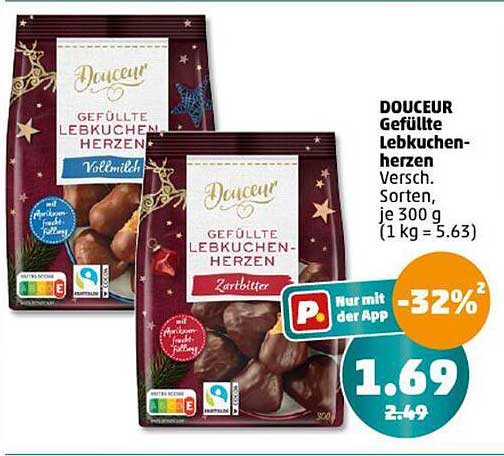 Sehen Sie sich das Douceur Gefüllte Lebkuchenherzen Angebot bei Penny an! Dieses fantastische Angebot ist jetzt im neuesten Penny Prospekt verfügbar. Nutzen Sie diese Chance und sparen Sie viel bei Ihrem Einkauf.