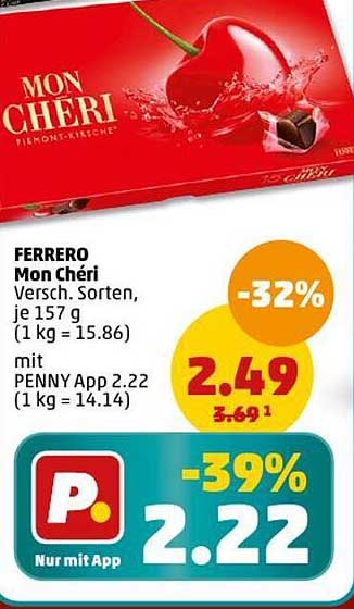 Entdecken Sie das großartige Ferrero Mon Chéri Angebot im neuesten Penny Prospekt. Neben diesem Angebot finden Sie noch viele weitere attraktive Rabatte. Sie können das Ferrero Mon Chéri einfach online über die Penny Website bestellen oder in einem Geschäft in Ihrer Nähe kaufen.