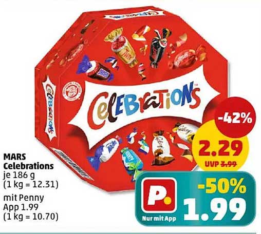 Sehen Sie sich jetzt das MARS Celebrations Angebot im Penny Prospekt an. Dieses Angebot ist gültig von 09.12.2024 bis 14.12.2024.