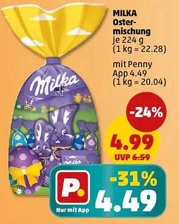 Sehen Sie sich jetzt das MILKA Oster-Mischung 224 g Angebot im Penny Prospekt an. Dieses Angebot ist gültig von 07.04.2025 bis 12.04.2025.