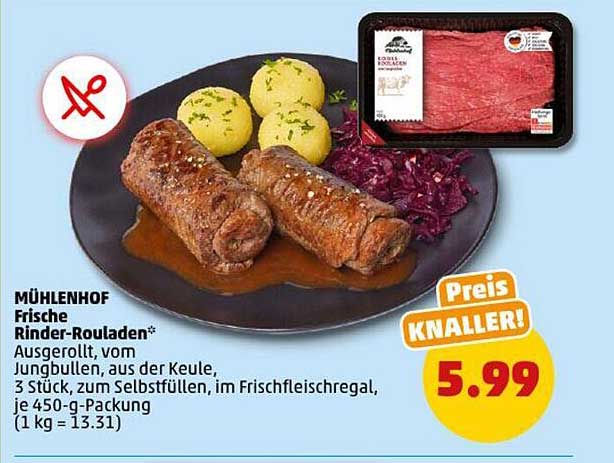 Sehen Sie sich das Mühlenhof Frische Rinder-Rouladen* Angebot bei Penny an! Dieses fantastische Angebot ist jetzt im neuesten Penny Prospekt verfügbar. Nutzen Sie diese Chance und sparen Sie viel bei Ihrem Einkauf.