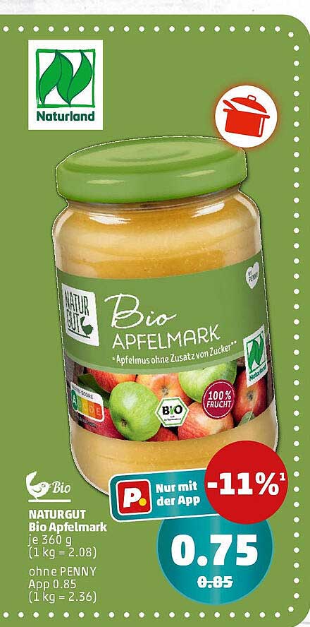 Sehen Sie sich jetzt das Naturgut Bio Apfelmark 360 g für nur 0,75 € Angebot im Penny Prospekt an. Dieses Angebot ist gültig von 22.09.2025 bis 27.09.2025.