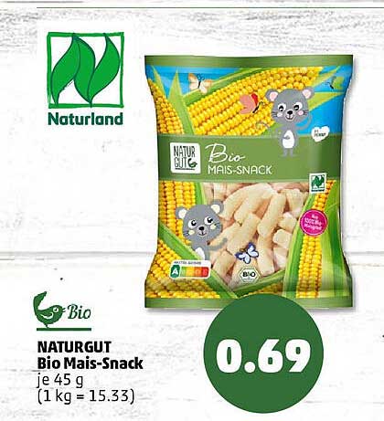 Der NATURGUT Bio Mais-Snack besteht aus hochwertigem Bio-Mais, der unter strengen ökologischen Standards angebaut wird. Die Verpackung enthält 45 g des feinen Snacks, und der Preis pro Kilogramm liegt bei attraktiven 15,33 Euro. Genießen Sie die natürliche Süße des Maises ohne künstliche Zusatzstoffe!