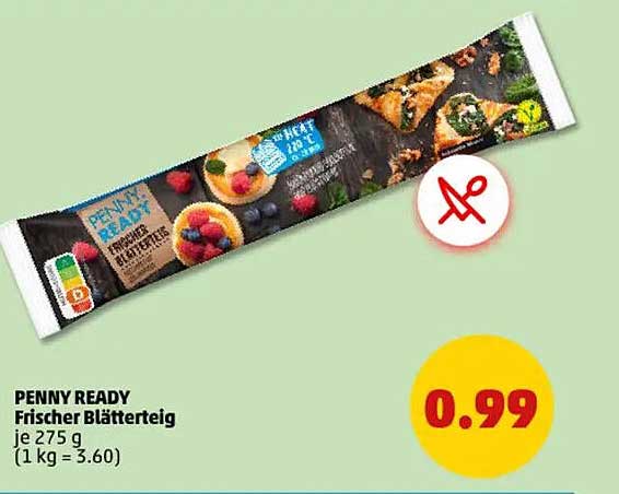 Sehen Sie sich jetzt das PENNY READY Frischer Blätterteig je 275 g Angebot im Penny Prospekt an. Dieses Angebot ist gültig von 07.04.2025 bis 12.04.2025.
