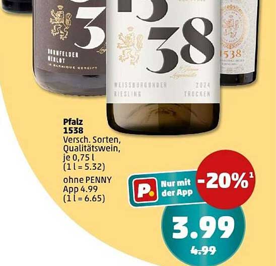 Sehen Sie sich jetzt das Pfalz 1538 Qualitätswein (0,75 L) - Verschiedene Sorten Angebot im Penny Prospekt an. Dieses Angebot ist gültig von 26.05.2025 bis 31.05.2025.