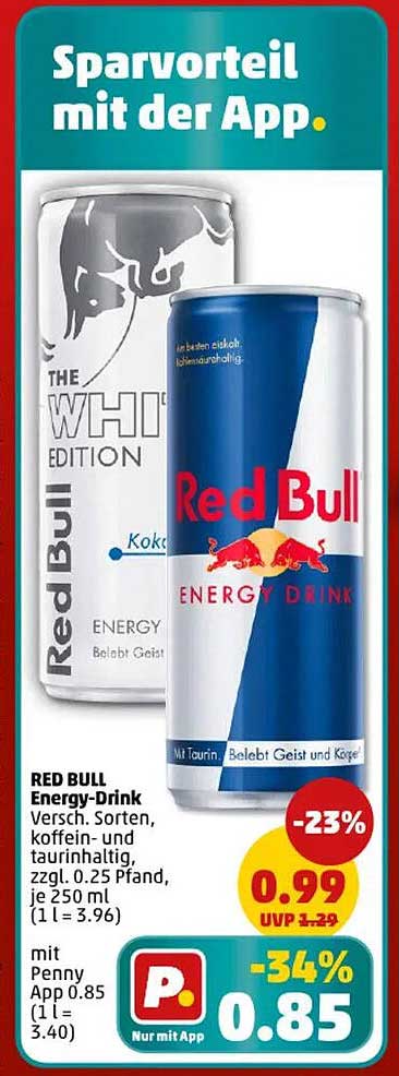 Sehen Sie sich das Red Bull Energy-Drink Angebot bei Penny an! Dieses fantastische Angebot ist jetzt im neuesten Penny Prospekt verfügbar. Nutzen Sie diese Chance und sparen Sie viel bei Ihrem Einkauf.