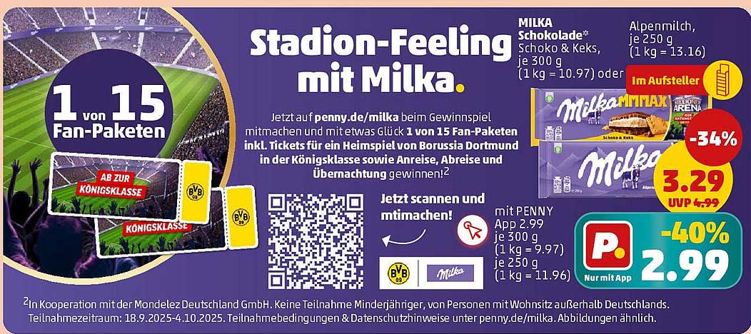 Sehen Sie sich jetzt das Stadion-Feeling mit Milka - 1 von 15 Fan-Paketen gewinnen! Angebot im Penny Prospekt an. Dieses Angebot ist gültig von 22.09.2025 bis 27.09.2025.