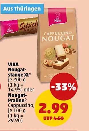 Sehen Sie sich jetzt das VIBA Nougatstange XL 200g oder Nougat-Praline 100g Angebot im Penny Prospekt an. Dieses Angebot ist gültig von 08.09.2025 bis 13.09.2025.