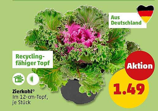 Sehen Sie sich jetzt das Zierkohl im 12-cm-Topf, je Stück Angebot im Penny Prospekt an. Dieses Angebot ist gültig von 22.09.2025 bis 27.09.2025.