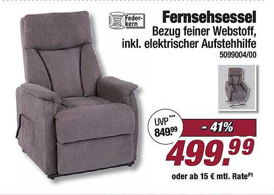 Sehen Sie sich jetzt das FernsehSessel - Bezugsfeiner Webstoff, inkl. elektrischer Aufstehhilfe Angebot im Poco Prospekt an. Dieses Angebot ist gültig von 20.06.2025 bis 27.06.2025.