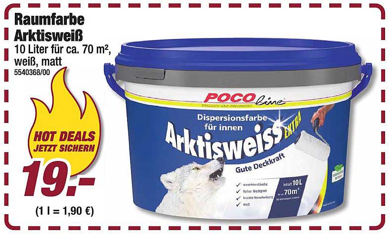 Sehen Sie sich jetzt das Raumfarbe Arktisweiß 10 Liter für ca. 70 m², weiß, matt Angebot im Poco Prospekt an. Dieses Angebot ist gültig von 09.08.2025 bis 15.08.2025.