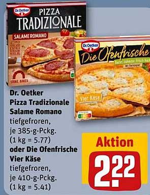 Der Preis für die Dr. Oetker Pizza Tradizionale Salame Romano liegt normalerweise bei 5,77 € pro Kilogramm, während die Ofenfrische Vier Käse mit 5,41 € pro Kilogramm ebenfalls sehr attraktiv ist. In dieser Aktionswoche erhalten Sie beide Pizzas jedoch für nur 2,22 €! Das ist eine enorme Ersparnis, die Ihnen die Gelegenheit gibt, gleich mehrere Pizzen auf einmal zu genießen.