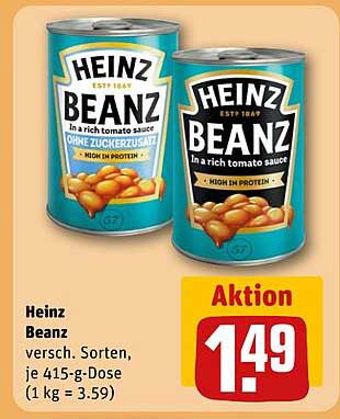 Entdecken Sie das großartige Heinz Beanz Angebot im neuesten REWE Center Prospekt. Neben diesem Angebot finden Sie noch viele weitere attraktive Rabatte. Sie können das Heinz Beanz einfach online über die REWE Center Website bestellen oder in einem Geschäft in Ihrer Nähe kaufen.
